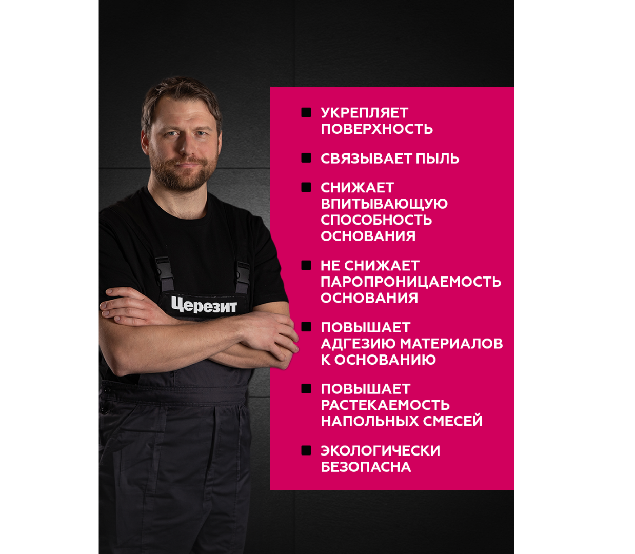 Грунтовка сохраняет паропроницаемость обрабатываемых оснований и эффективно связывает пылевые частицы на их поверхности. В состав введён пигмент светло-жёлтого оттенка, что позволяет легко отличать загрунтованные участки от необработанных.