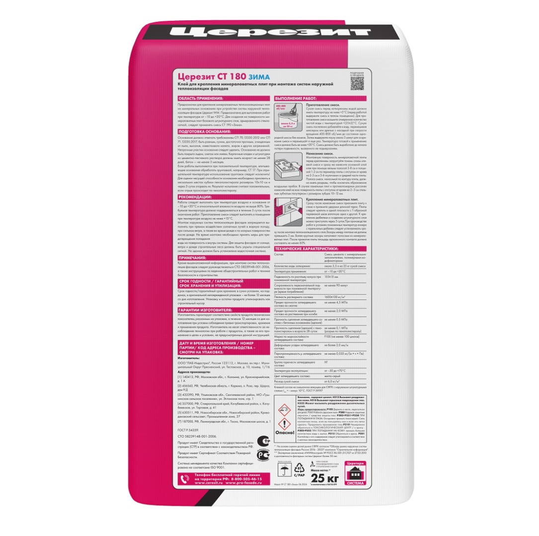 Описание товара: "Клей Ceresit СТ 180 для крепления минераловатных плит Зима (25 кг)"