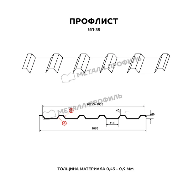 Профлист МП-35 в равной степени подходит как для облицовки стен, ограждений, так и для кровли, скатной и плоской. Металлопрокат с этим профилем отличается рабочей шириной 1035 мм. Облегчить установку кровли поможет заказ проката необходимой длины, равной длине ската, но не более 12 метров. Успешно используется МП-35 и при строительстве несложных каркасных объектов. Подходит в качестве перегородок в подсобных постройках, ангарах. Для изготовления МП-35 используются оцинкованная сталь толщиной от 0,45 до 0,9 мм. Этот профиль не имеет специальных желобков или канавок, добавляющих ему жёсткость. Тем не менее, правильная геометрия листа и характерные трапециевидные волны гарантируют изделию достаточно высокую несущую способность и стойкость к излому. Большой выбор оттенков и фактур в ассортименте финишных покрытий расширяет дизайнерские возможности по созданию МП-35.Покрытие VikingMP® E: